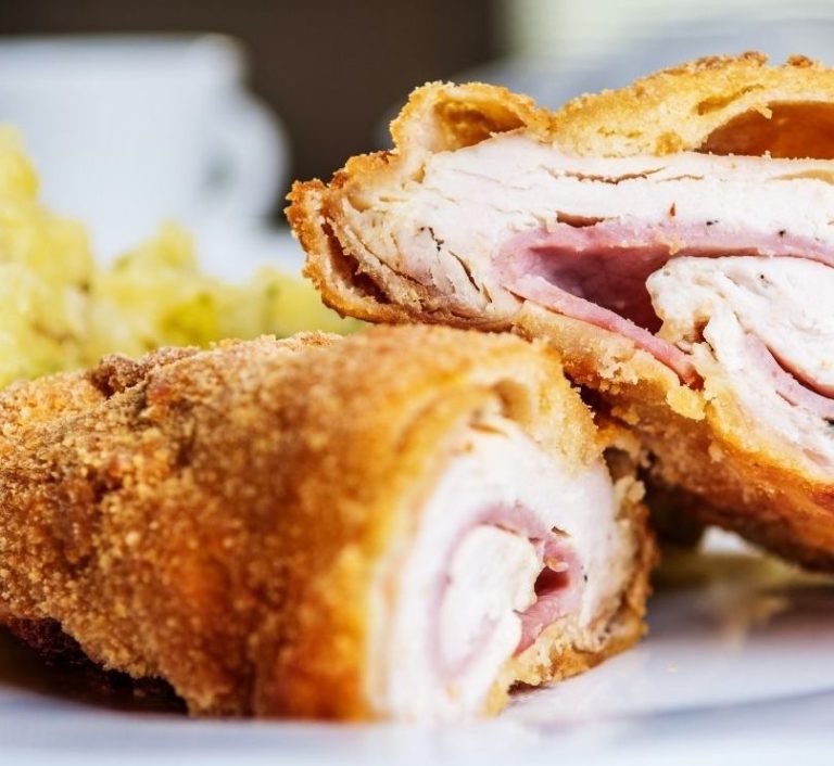 Fein gewürzt, mit herzhaftem Schinken und geschmolzenem Käse gefüllt, entfaltet sich bei jedem Bissen eine köstliche Kombination aus saftiger Fleischqualität und cremiger Füllung. Außen knusprig, innen wunderbar zart – perfekt begleitet von frischen Beilagen und einer feinen Sauce.